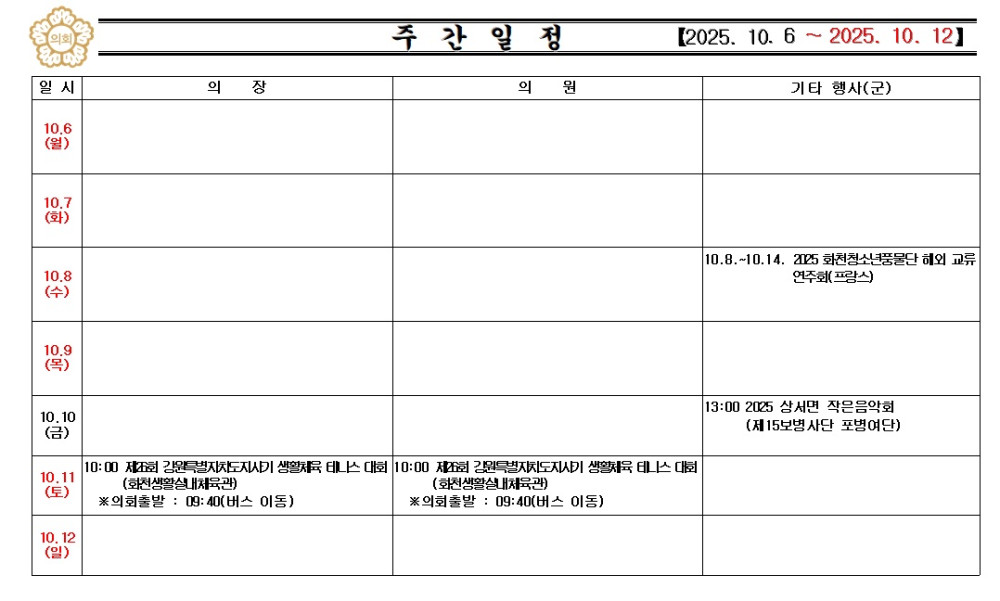 화천군의회 주간행사(2025.10.6.~2025.10.12.) 입니다. 페이지 정보 작성자 : 담당자 날짜 : 작성일25-10-10 09:42 조회 : 63회 이전글 다음글 목록 본문 화천군의회 주간행사(2025.10.6.~2025.10.12.) 입니다. 이전글 다음글 목록