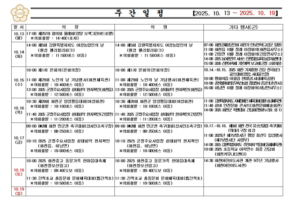 화천군의회 주간행사(2025.10.13.~2025.10.19.) 입니다. 페이지 정보 작성자 : 담당자 날짜 : 작성일25-10-13 10:15 조회 : 78회 이전글 다음글 목록 본문 화천군의회 주간행사(2025.10.13.~2025.10.19.) 입니다. 이전글 다음글 목록