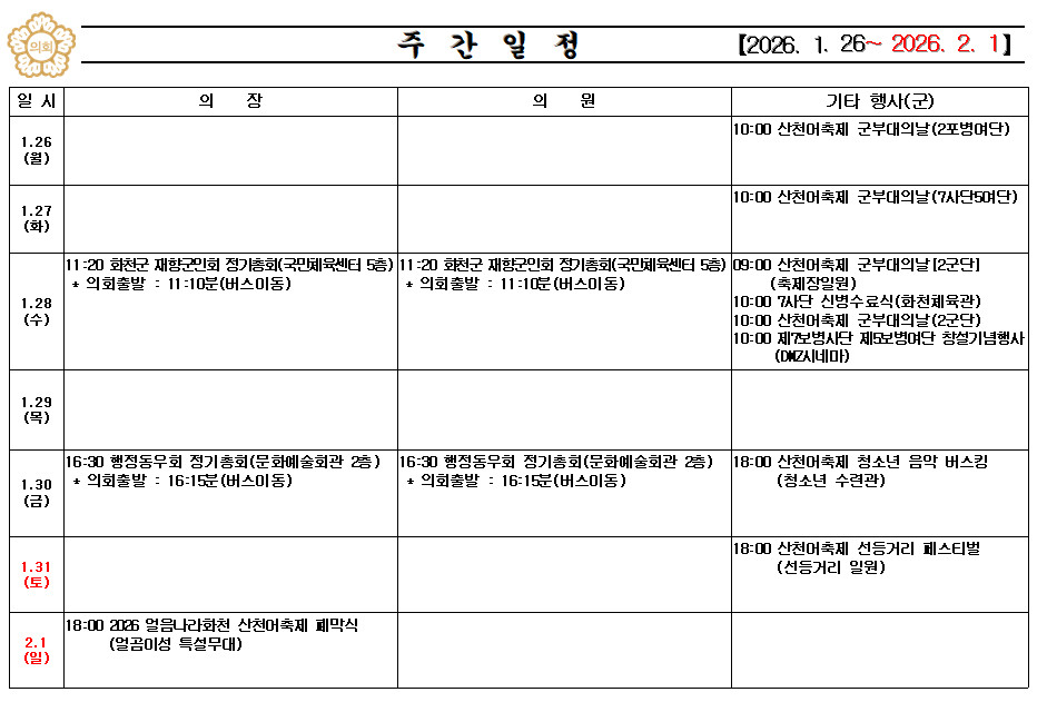 화천군의회 주간행사(2026.1.26.~2026.2.1.) 입니다. 페이지 정보 작성자 : 운영자 날짜 : 작성일26-01-26 09:20 조회 : 17회 다음글 목록 본문 화천군의회 주간행사(2026.1.26.~2026.2.1.) 입니다. 다음글 목록