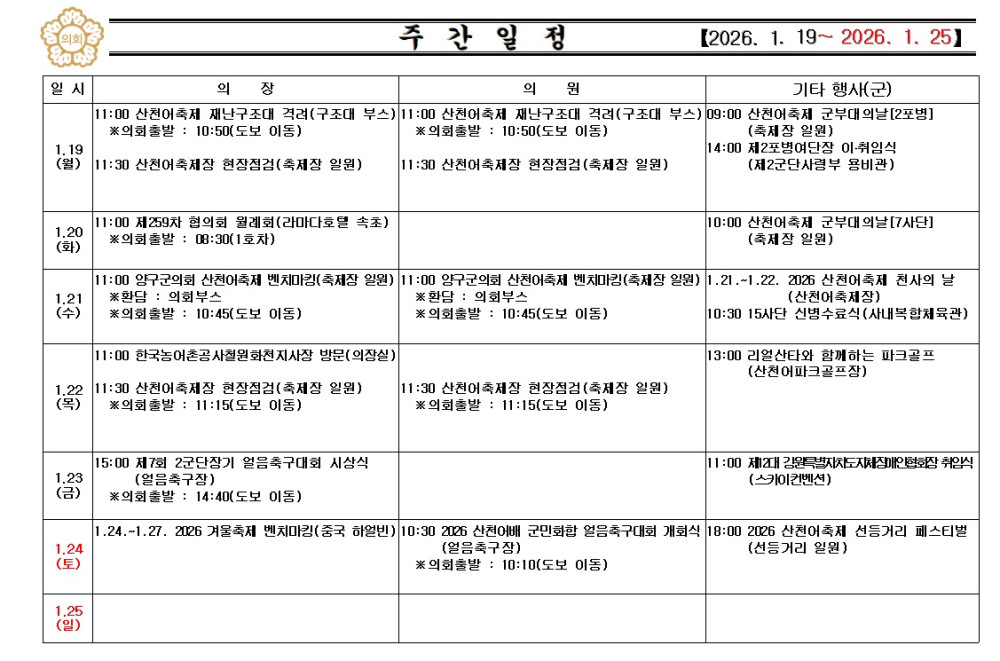 화천군의회 주간행사(2026.1.19.~2026.1.25.) 입니다. 페이지 정보 작성자 : 담당자 날짜 : 작성일26-01-19 09:30 조회 : 19회 다음글 목록 본문 화천군의회 주간행사(2026.1.19.~2026.1.25.) 입니다. 다음글 목록