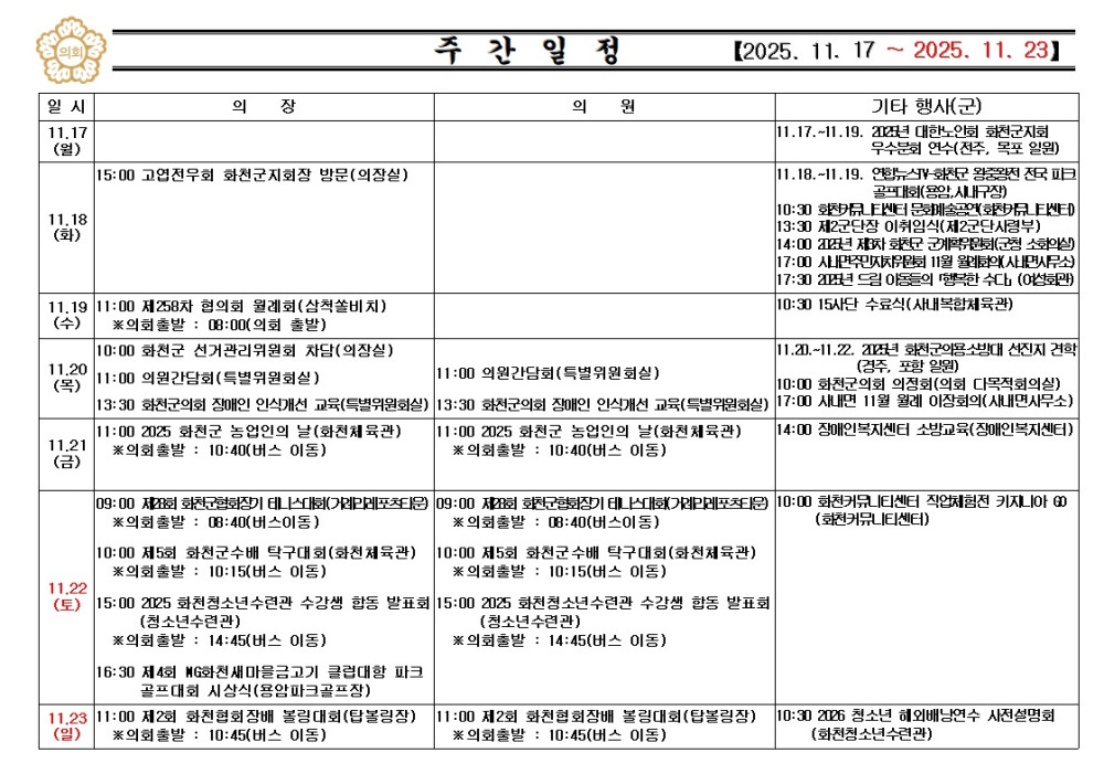 화천군의회 주간행사(2025.11.17.~2025.11.23.) 입니다. 페이지 정보 작성자 : 담당자 날짜 : 작성일25-11-18 09:06 조회 : 24회 다음글 목록 본문 화천군의회 주간행사(2025.11.17.~2025.11.23.) 입니다. 다음글 목록