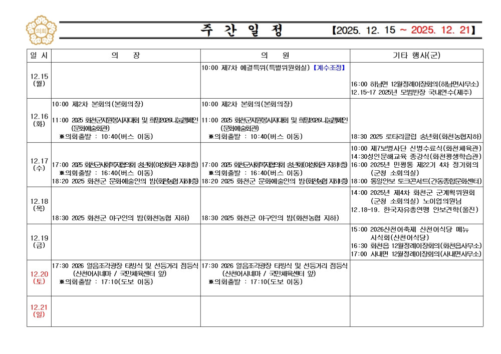 화천군의회 주간행사(2025.12.15.~2025.12.21.) 입니다. 페이지 정보 작성자 : 운영자 날짜 : 작성일25-12-15 11:11 조회 : 63회 이전글 다음글 목록 본문 화천군의회 주간행사(2025.12.15.~2025.12.21.) 입니다. 이전글 다음글 목록